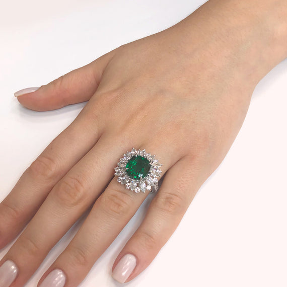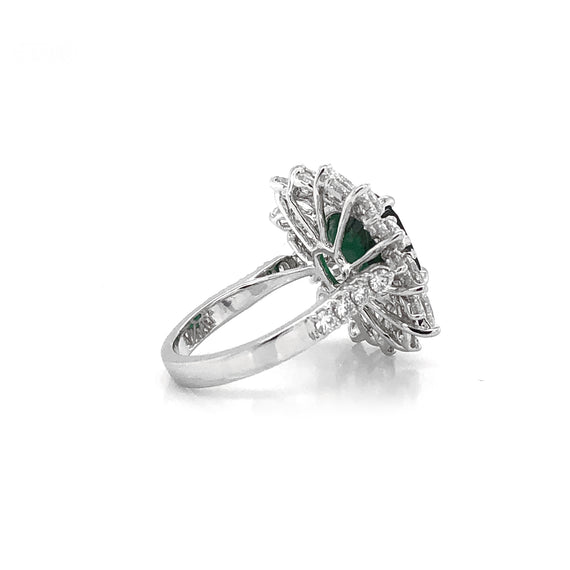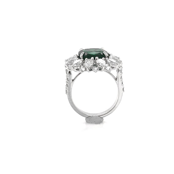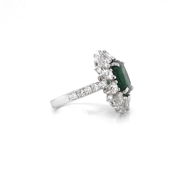 - This brilliant sunburst style ring is crowned with a green cushion cut emerald 3.13 carat stone from Zambia.
