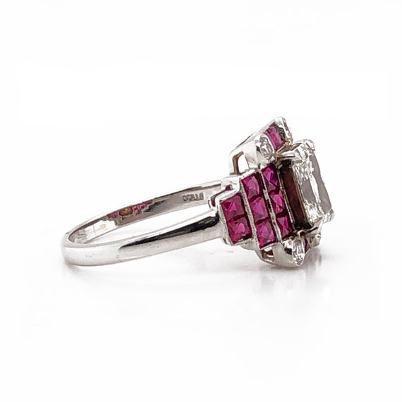 - French cut rubies 1.28 ct from Burma frames the center stone and adorns the front sides of the platinum 950 ring.